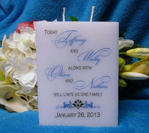 This candle comes with the names of the bride and groom, children's name, and date of wedding. You have your choice of print color.